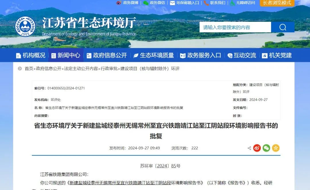 近日 江苏省生态环境厅官网发布 关于《新建盐城经泰州无锡常州 至宜兴铁路靖江站至江阴站段 环境影响报告书》的批复