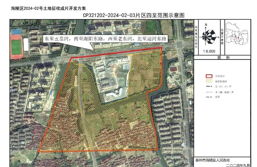 近日,泰州市海陵区2024-02号土地征收成片开发方案曝光,目前正在征求意见。本方案共包含3个片区,拟征收集体土地总面积约162公顷。
