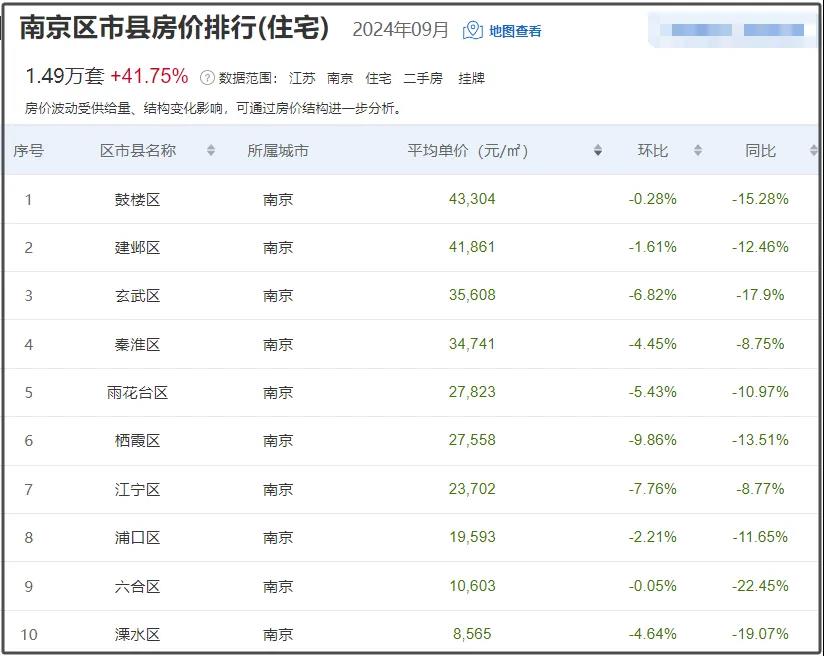 目前南京二手房均价29183元/㎡,挂牌均价最高的是鼓楼区为43304元/㎡,新增房源1.49万套。