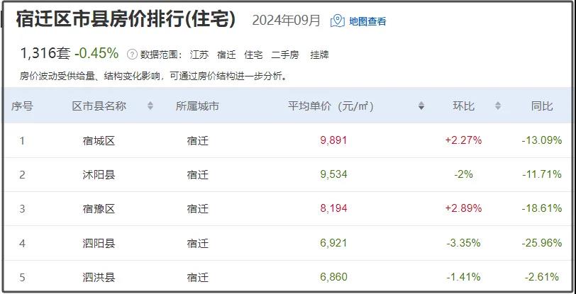 从具体区域来看,3个区域房价呈现下跌趋势,泗阳县跌幅最高,跌幅3.35%。