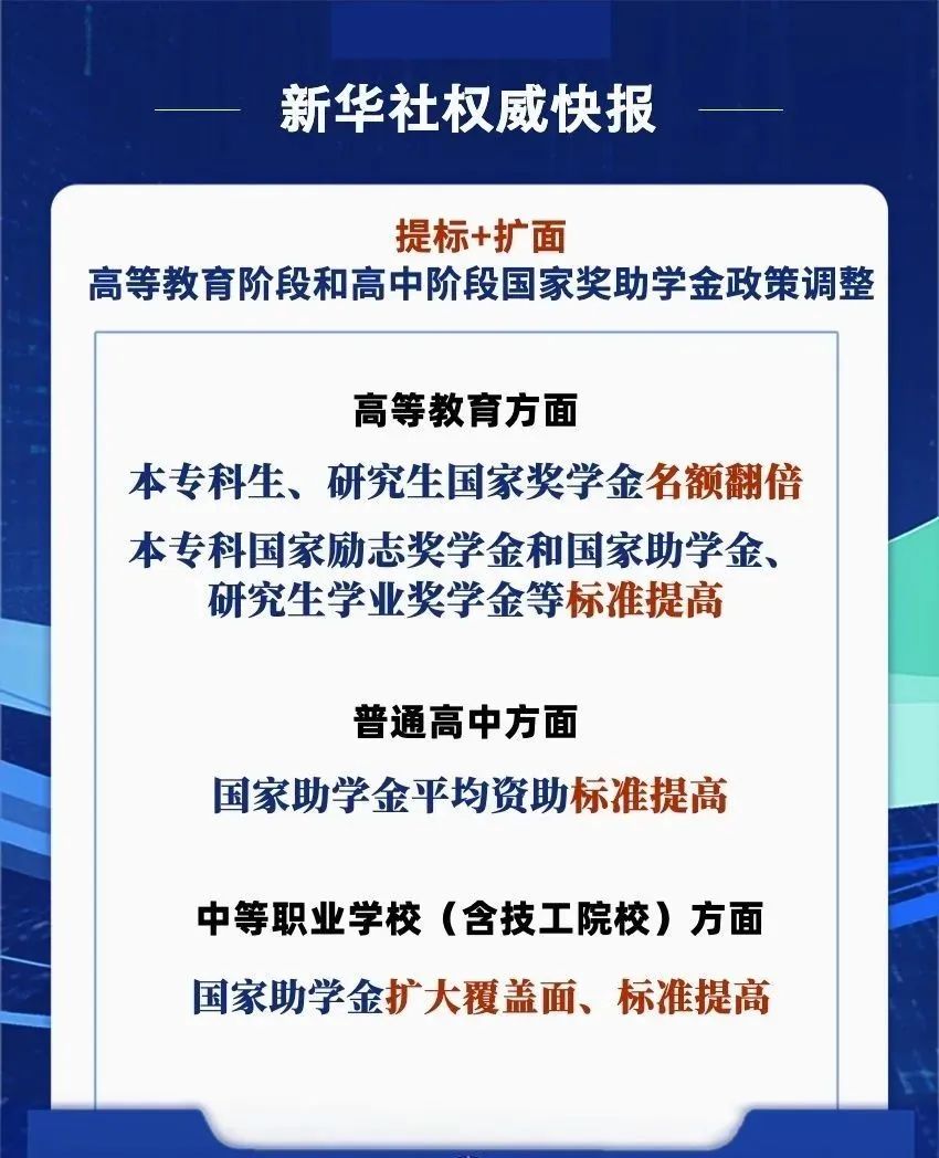 此次学生资助政策调整将用更大力度奖优助困、更多覆盖学生群体,将进一步完善覆盖全学段学生资助体系,落实党中央、国务院关于一揽子增量政策有关部署。