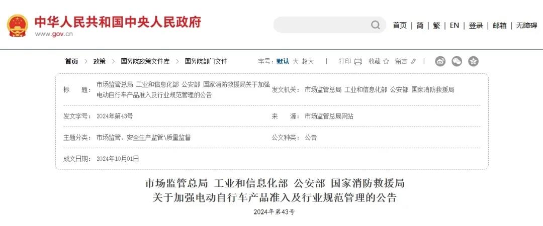 日前 市场监管总局、工业和信息化部 公安部、国家消防救援局 四部门联合发布 《关于加强电动自行车产品准入 及行业规范管理的公告》 11月1日起 不符合《电动自行车电气安全要求》等 相关强制性国家标准的电动自行车 不得生产、销售、进口 11月1日后销售的 不具有有效认证证书的电动自行车 不予办理登记上牌