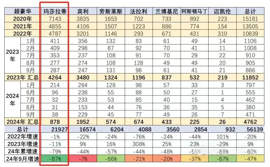 今年以来,玛莎拉蒂销量开始崩塌。根据乘联会公布的数据显示,2024年1至9月,玛莎拉蒂在中国市场的进口销量分别为214辆、89辆、129辆、140辆、109辆、96辆、32辆、31辆和38辆,总计878辆,同比下滑79%。