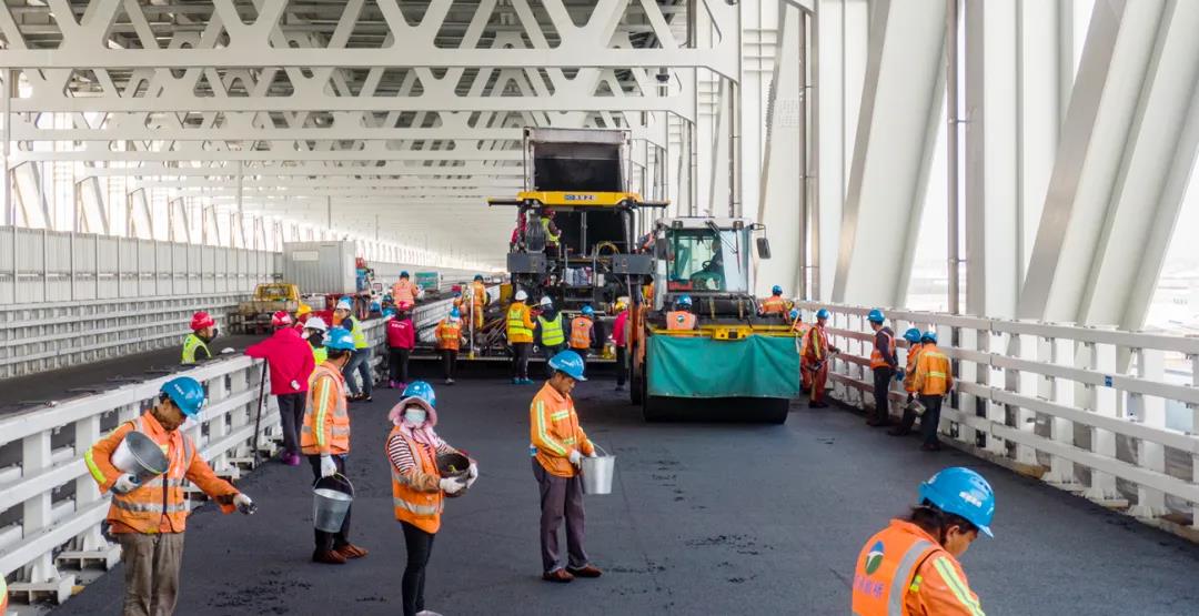 常泰长江大桥是长江上首座集高速公路、城际铁路、普通公路三种方式于一体的过江通道,全长10.03公里,其中双层连续钢桁梁长度达到4266米。上下层钢桥面铺装总面积超25万平方米,相当于33个标准足球场,平均铺装厚度在6-6.8厘米间。