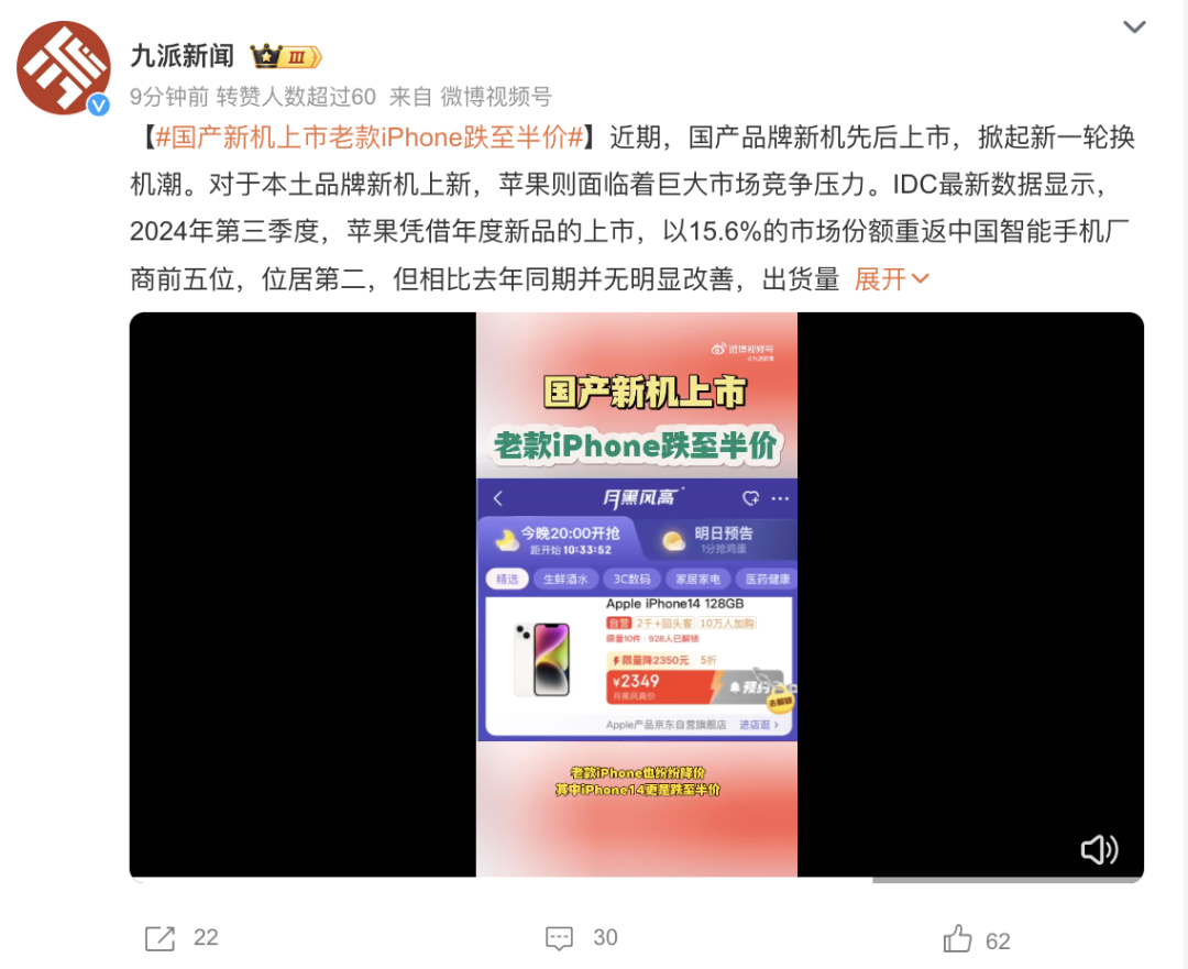 11月10日,话题“国产新机上市老款iPhone跌至半价”冲上微博热搜。