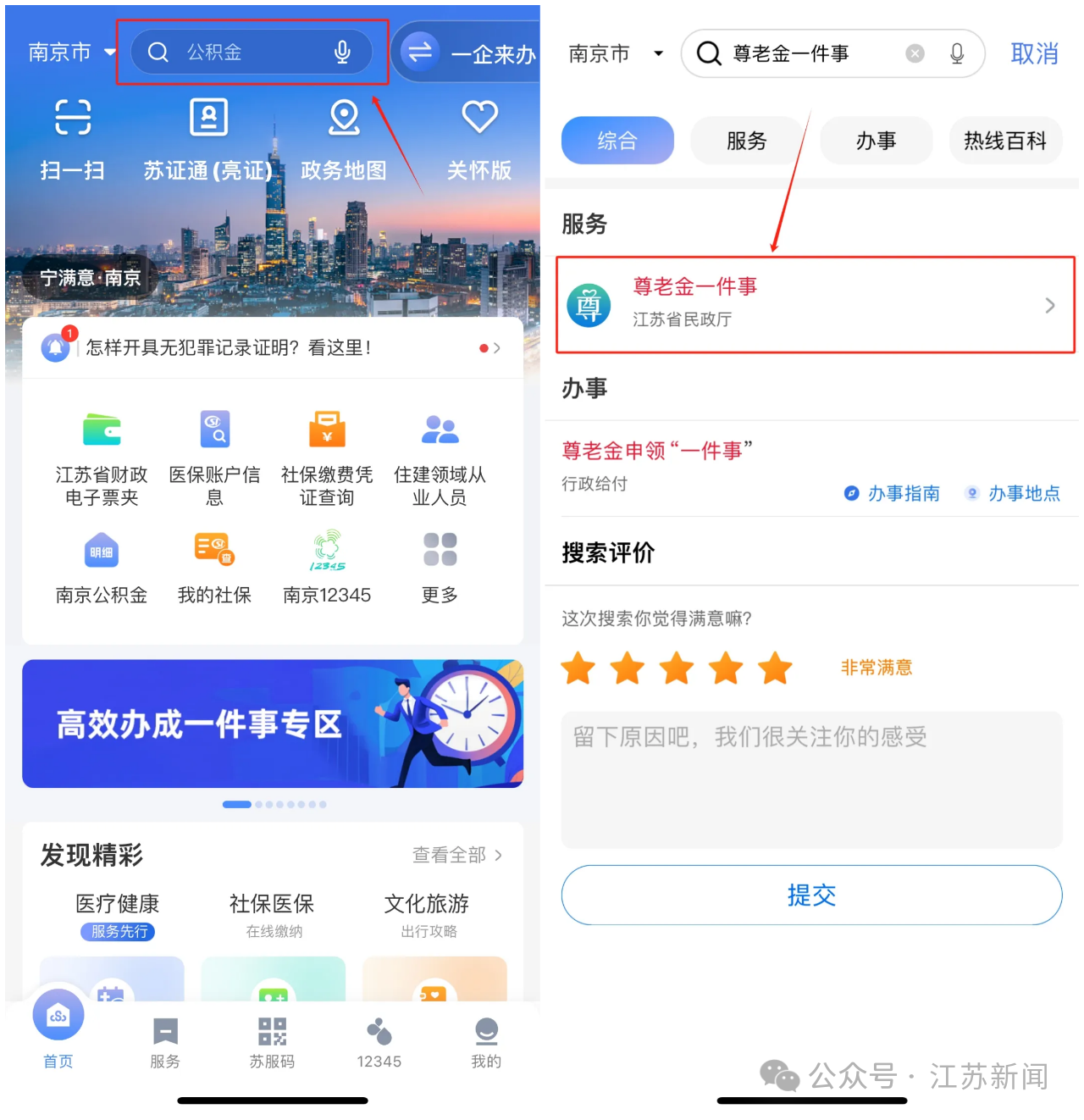 打开“苏服办”(APP、支付宝小程序),在首页搜索“尊老金一件事”进入服务。