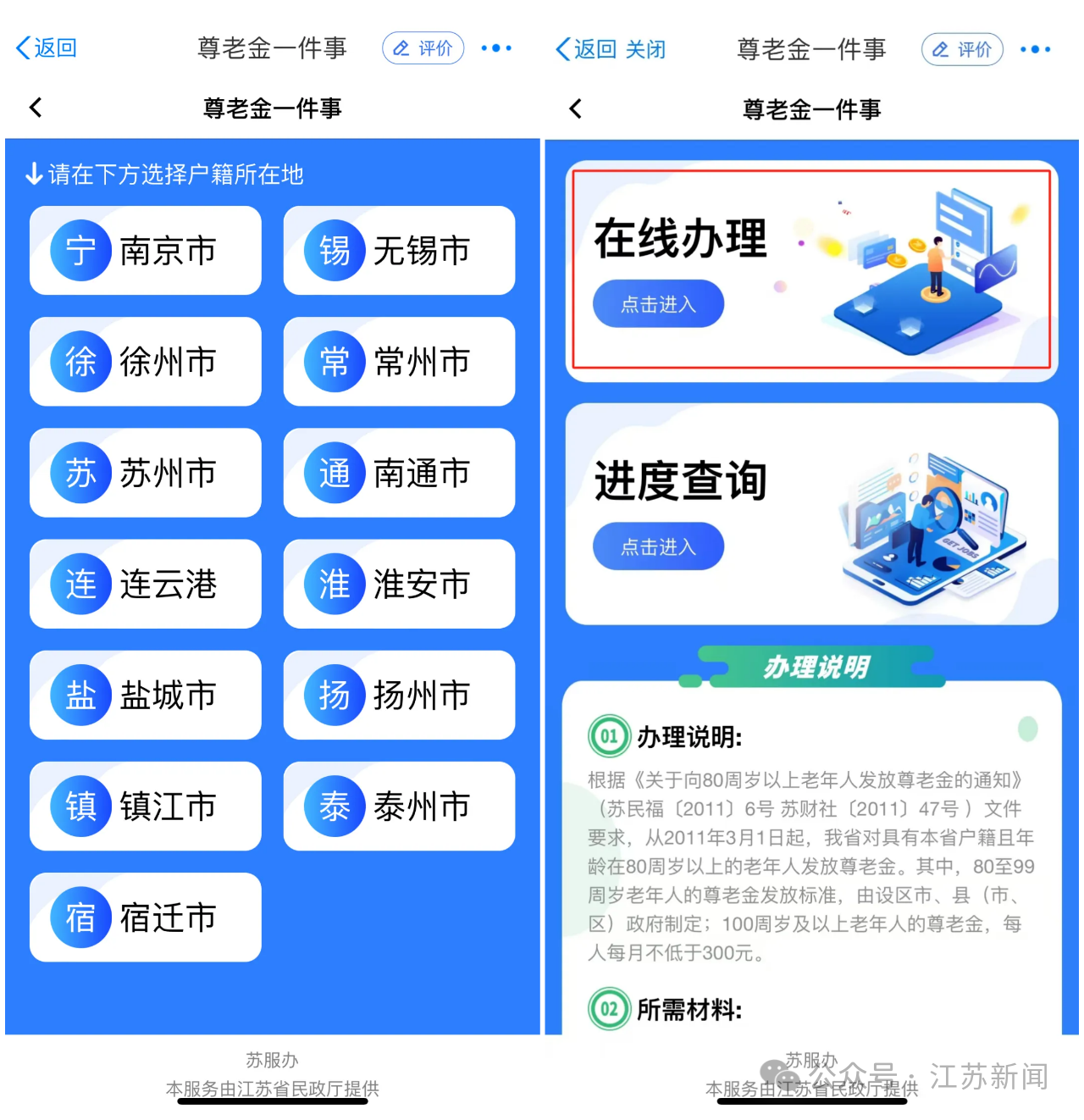 选择户籍所在地(苏州已实现尊老金自动发放,无需申请),点击在线办理,进入办理页面。