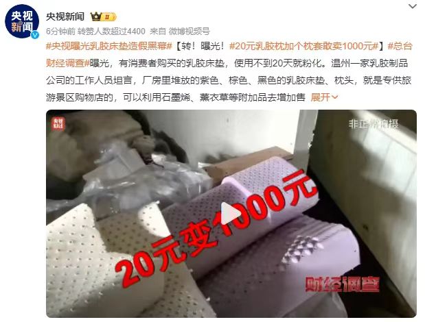 近日 #央视曝光乳胶床垫造假黑幕#等相关话题 引发网友热议 许多假乳胶枕也被曝光出来 据媒体报道,一些劣质乳胶枕除了乳胶含量不达标,功能减弱,甚至还会挥发苯乙烯致癌物,对人体造成伤害。