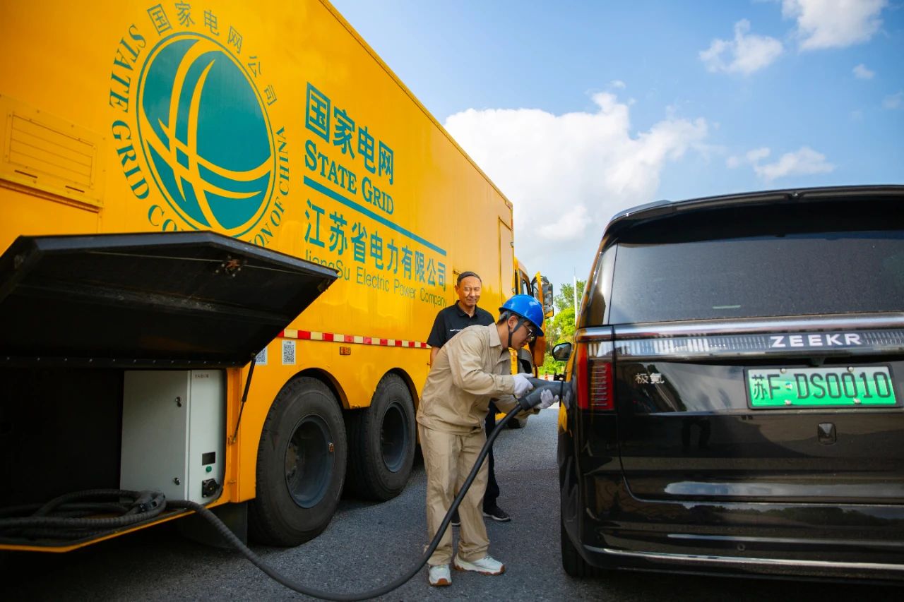 10月1日上午,在江苏省启扬高速姜堰白米服务区内,姜堰公司用电检查班葛鹏程和夏阳辰正在引导过往车辆利用移动充电车进行充电,让新能源车主享受安全、绿色的出行体验。