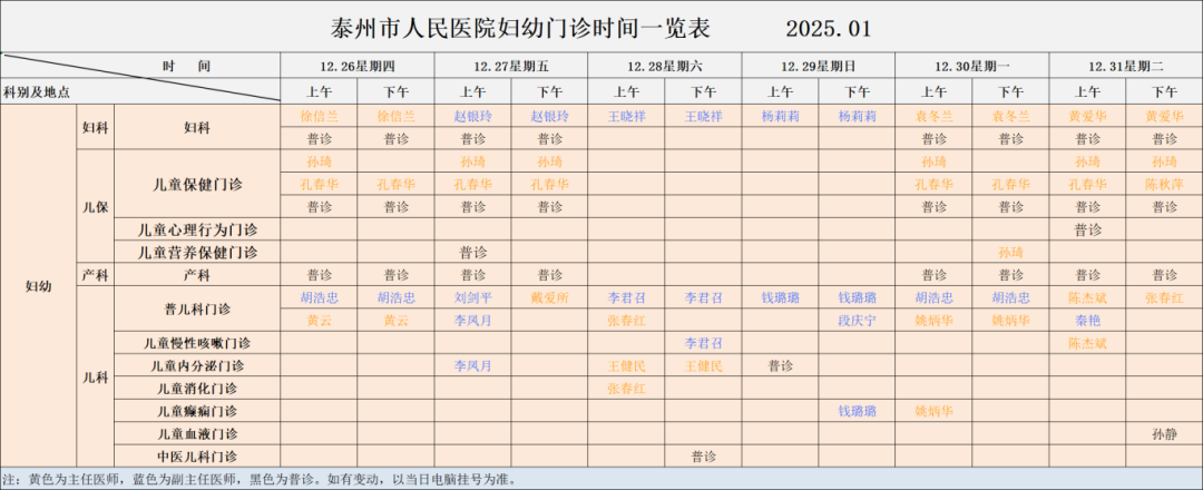 泰州市妇幼保健院/泰州市人民医院妇幼分院1月 门诊时间一览表