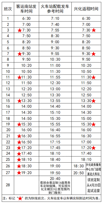 专线由6个快线班次增加至12个快线班次(详见时刻表)。快线仅停靠泰州客运南站、泰州火车站、兴化客运站3个站点,大幅压缩行程耗时,满足部分旅客高效出行的需求,让城际通行更加快捷。 自2025年4月20日起,泰州-兴化专线优化20:40夜间班次。此班次采用7座商务车,在兴化市区服务范围内(东至文峰路、西至兴临路、南至城南路、北至五里东路)实现“点对点”直达服务,有效解决夜间换乘不便的痛点,该班次票价为30元/人次。旅客凭购票电子凭证,在泰州火车站公交广场乘车,最快1小时抵达兴化城区。