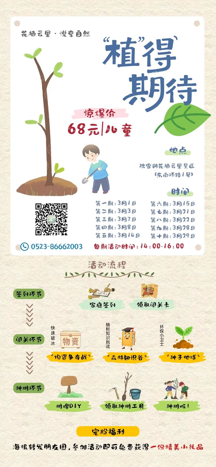 春风十里,不如一抹绿意 这个三月 我们想邀请您和孩子走进花栖云里景区 加入我们的‘植’得期待植树限定研学 用一场别开生面的自然派对 唤醒孩子身体里的春天!