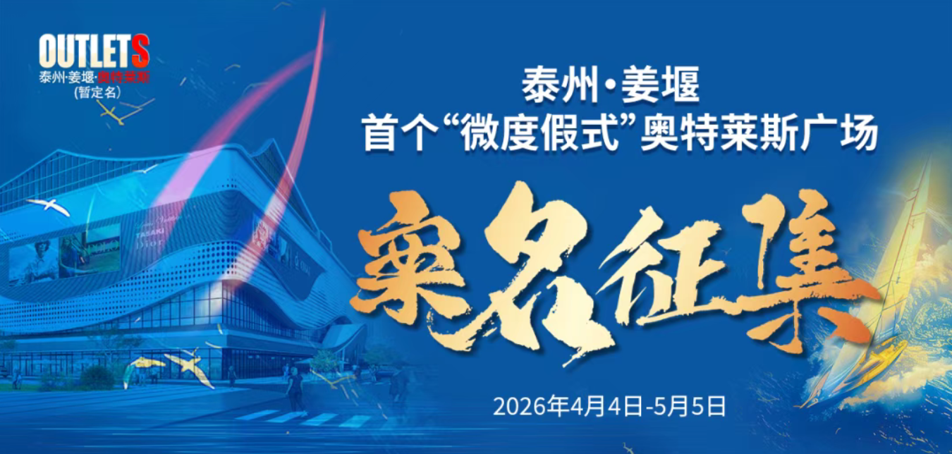 泰州市民请注意!姜堰即将落成一座大型商业综合体,系区域首个微度假式奥特莱斯广场,现面向全社会公开征集项目案名,入选者可获得20000元现金大奖。