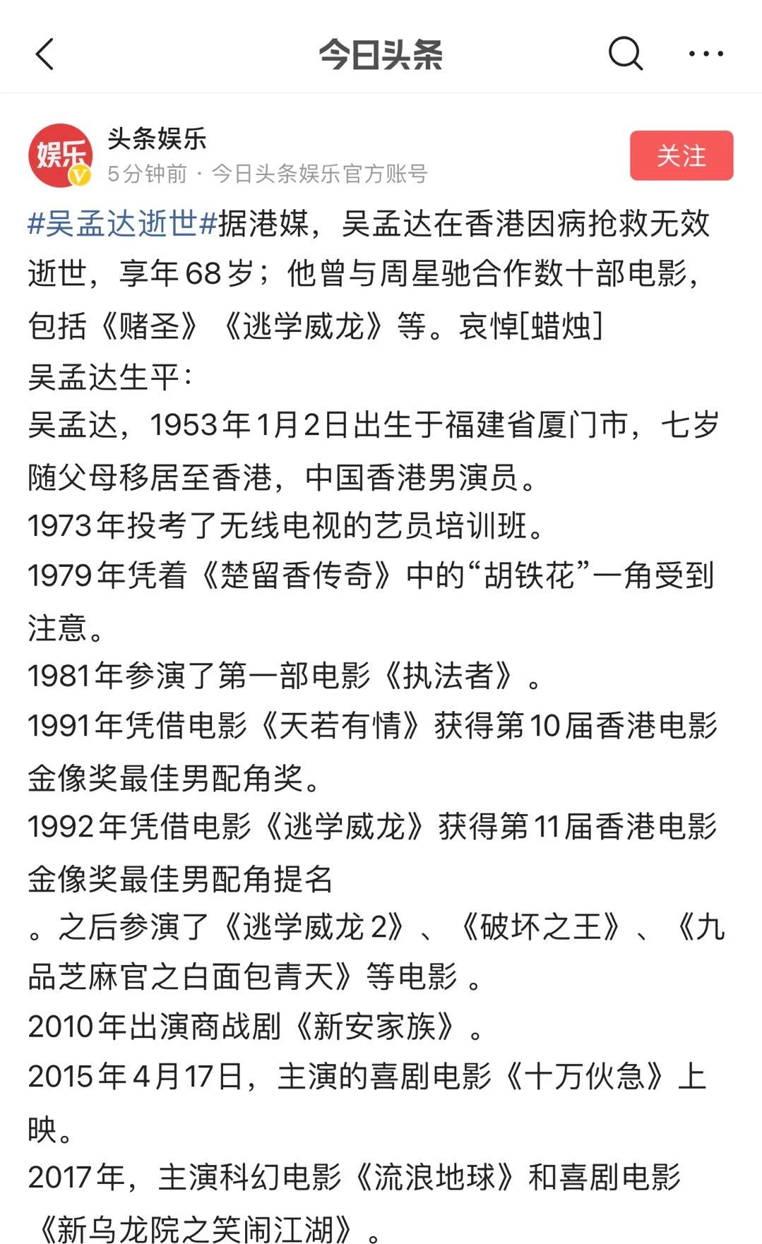 据港媒,吴孟达在香港因病抢救无效逝世,享年68岁;他曾与周星驰合作数十部电影,包括《赌圣》《逃学威龙》等。