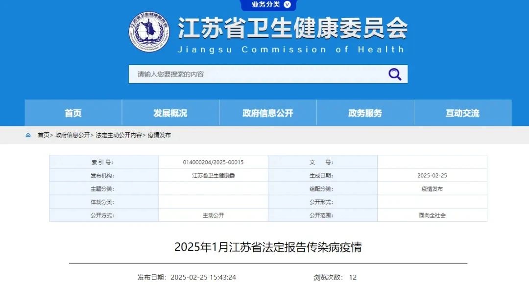 2月25日 江苏省疾病预防控制局发布 2025年1月 江苏省法定报告传染病疫情 数据显示 报告发病数最高的为 丙类传染病中的流行性感冒 共报告发病数225902例