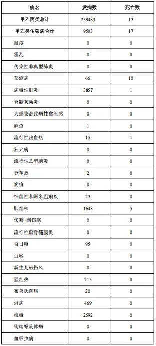 2025年1月1日0时至1月31日24时,全省共报告甲、乙类法定传染病发病9503例,死亡17人;本月除鼠疫、霍乱、传染性非典型肺炎、脊髓灰质炎、人感染高致病性禽流感、狂犬病、流行性乙型脑炎、炭疽、伤寒+副伤寒、流行性脑脊髓膜炎、白喉、新生儿破伤风、钩端螺旋体病、血吸虫病、人感染H7N9禽流感无发病报告外,其余15种甲、乙类传染病均有病例报告。报告发病数居前五位的病种依次为:肝炎、梅毒、肺结核、新型冠状病毒感染、淋病,占报告发病总数的95.17%。报告死亡数居前三位的病种依次为:艾滋病、肺结核、肝炎/流行性出血热(并列),占报告死亡总数的100%。