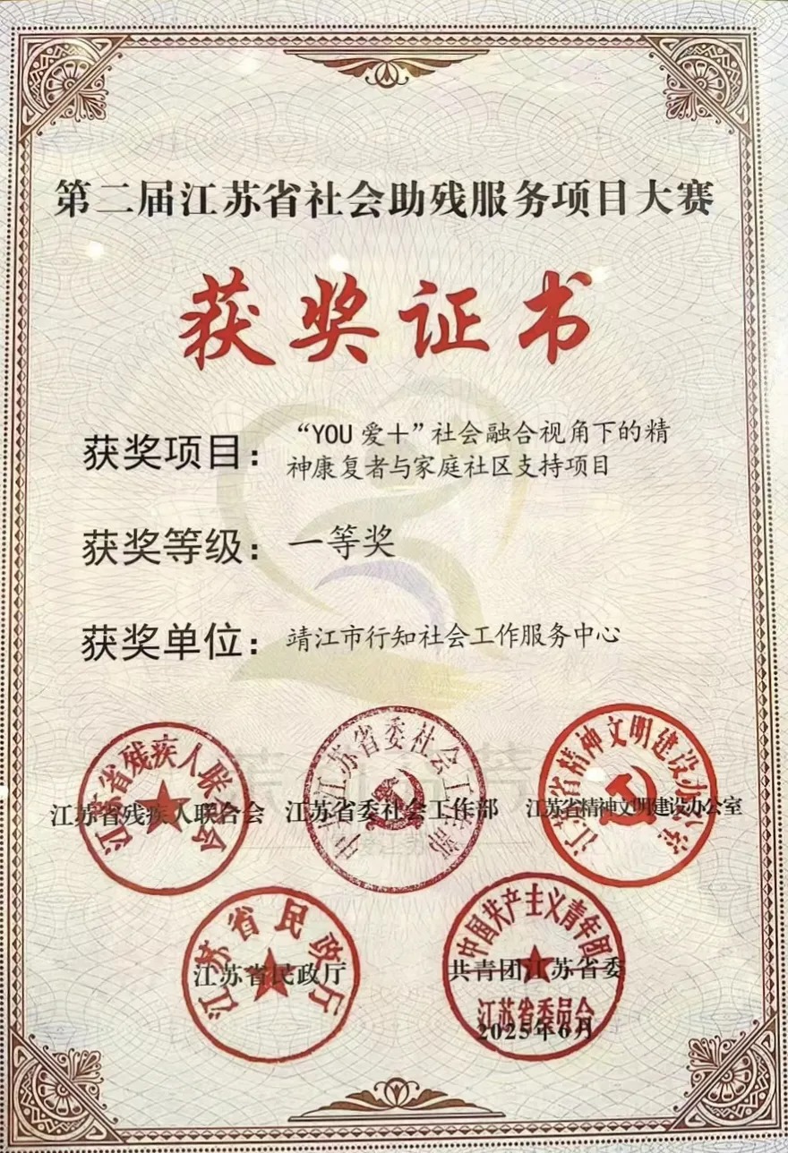 6月20日至21日,第二届江苏省社会助残服务项目大赛暨长三角地区社会助残服务项目分享会在南京成功举办。本次大赛由江苏省残疾人联合会、省委社会工作部、省文明办、省民政厅、共青团江苏省委联合主办,共收到174个优质助残服务项目申报,覆盖残疾人生活照料、健康服务、就业支持、文体活动、法律服务、社会融入及其他领域(共7类)。经过激烈角逐,最终评选出20个一等奖,30个二等奖和50个三等奖。其中,泰州市民政局推荐申报的“泰有爱·兜底监护”——“YOU爱+”精神智力障碍社工服务项目凭借其创新性和实效性脱颖而出,并且该项目为精神障碍社会服务类项目中唯一获一等奖的项目。